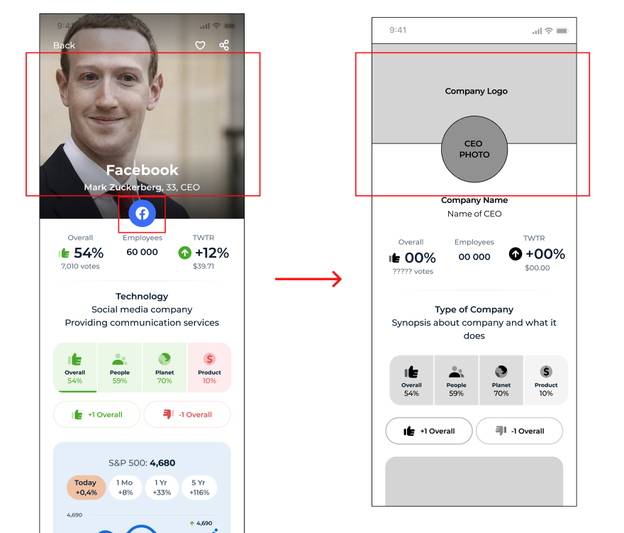 We presented the proposed redesigns to our supervisor in order to get his feedback and approval to move forward. I made adjustments to the low-fidelity design in order to align with the expectation and feedback provided by our supervisor. In particular, because Share Scoops has no control over how the company image data is presented, the header image has to remain in square dimensions. I took this into consideration by making the company logo fit in a square dimension, while the CEO photo stayed the same in the redesign.
